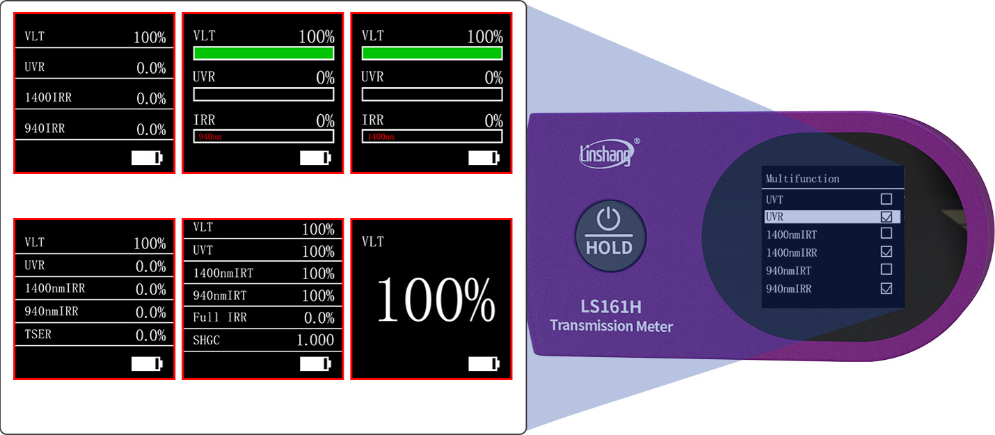 Cihazda, net ve sezgisel sonuçlar için renk kodlu ilerleme çubuklarıyla IR, UV reddetme oranları ve görünür ışık geçirgenliğini gösteren nokta matrisli TFT renkli ekran bulunur.