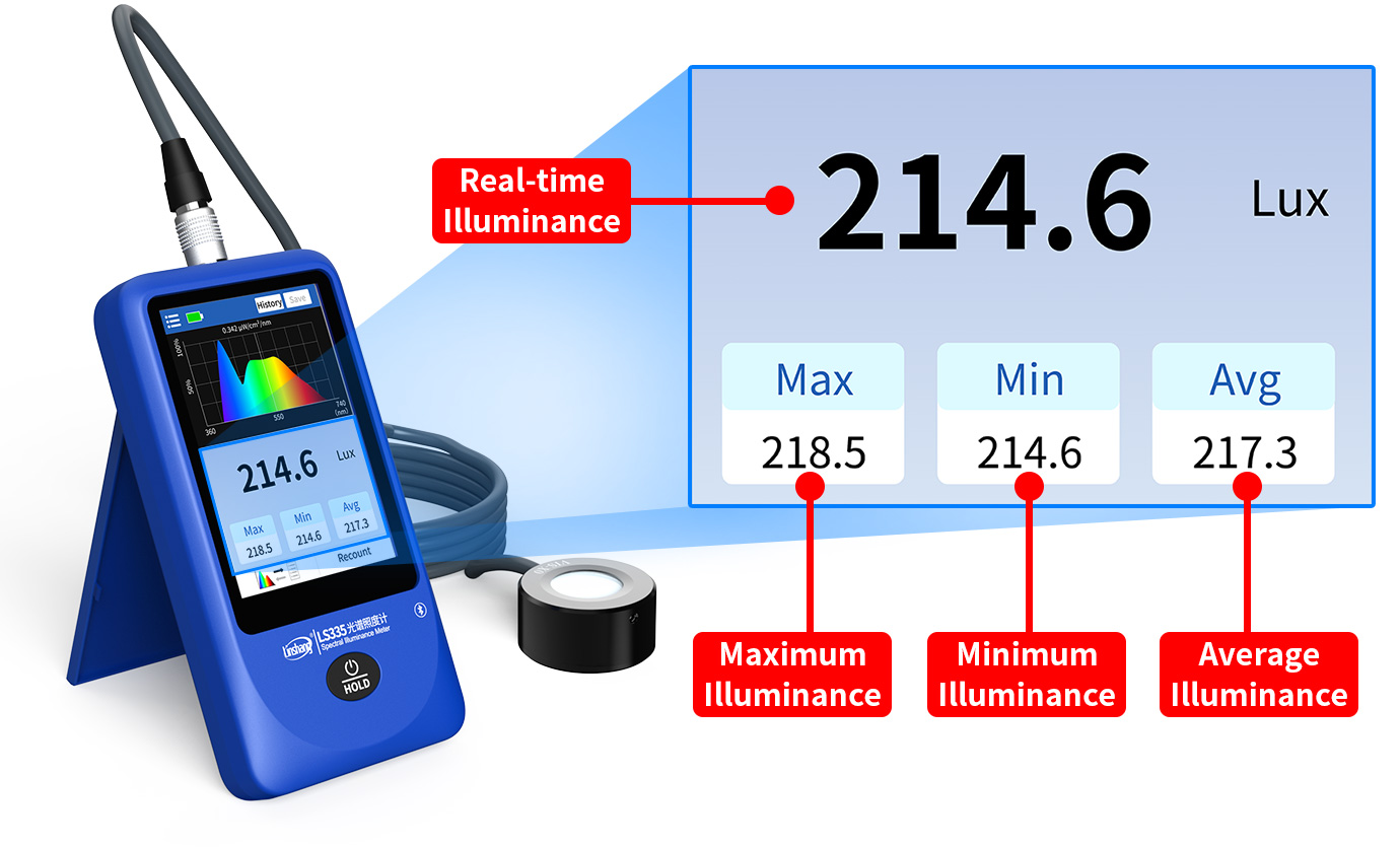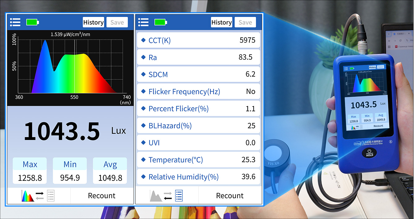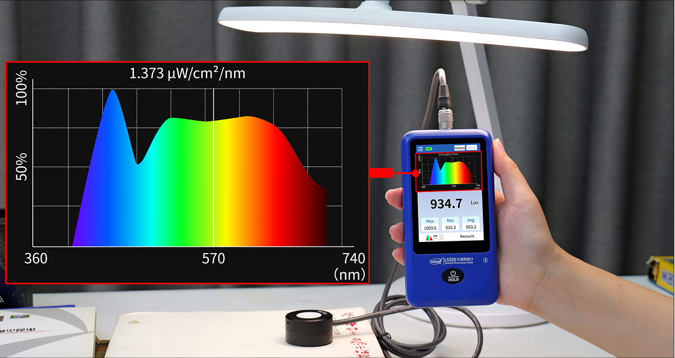 LS335, modüler bir spektral aydınlatma ölçer olup, ana ünite 3,5 inç renkli dokunmatik ekran tasarımına sahiptir. Cihazın kullanımı basit ve kullanışlıdır. Çeşitli alanlarda, ışık kaynağı aydınlatması, dış mekan aydınlatması, sera aydınlatması, sahne ışıkları gibi alanlarda aydınlatma, ultraviyole endeksi, renk sıcaklığı, flicker frekansı, dalgalanma derinliği, renk geri verme endeksi, renk toleransı, sıcaklık, nem ve mavi ışık tehlike oranı gibi parametreleri ölçebilir. Ölçülen spektral eğri, ışık kaynağının türünü ve mavi ışık tehlikesini tanımak için kullanılabilir.