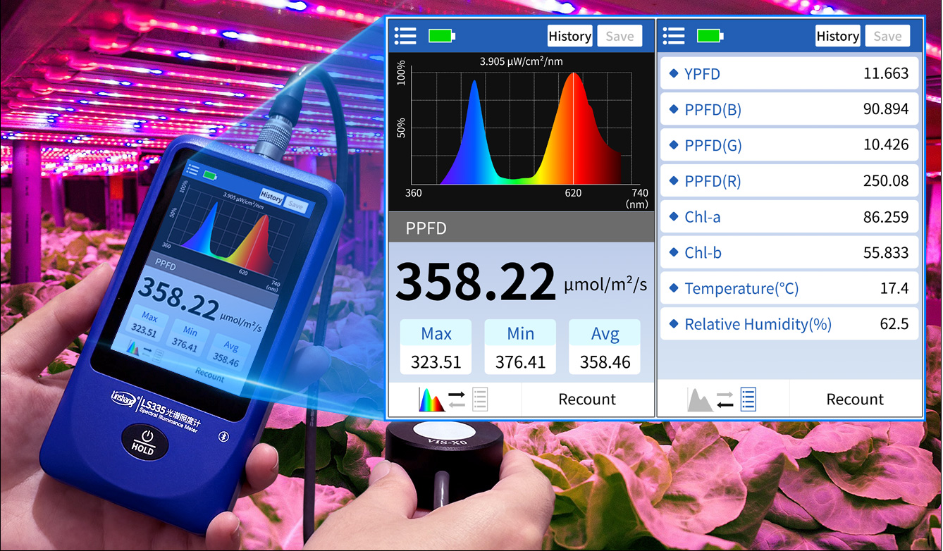 Cihaz, profesyonel bitki aydınlatma modu sunar ve fotosentetik ışın yoğunluğu (PPFD), mavi/yeşil/kırmızı spektral PPFD, YPFD, klorofil A/B içeriği, sıcaklık ve nem gibi parametreleri hassas bir şekilde ölçebilir. Ev bahçeciliği, bitki fabrikaları, sera aydınlatması, tarımsal araştırmalar gibi alanlarda bilimsel ve doğru ölçüm desteği sağlar. Kullanıcıların verimli ve akıllı bir tarım yönetimi sağlamasına yardımcı olur, bitkilerin büyüme verimliliğini ve kalitesini artırır.